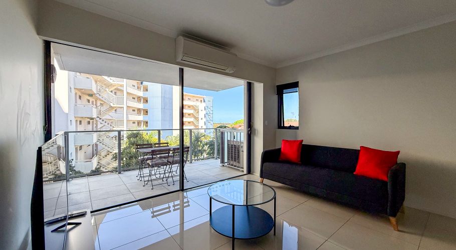- A sunlit undercover balcony overlooking the complex facilities, garden palms and swimming pool
